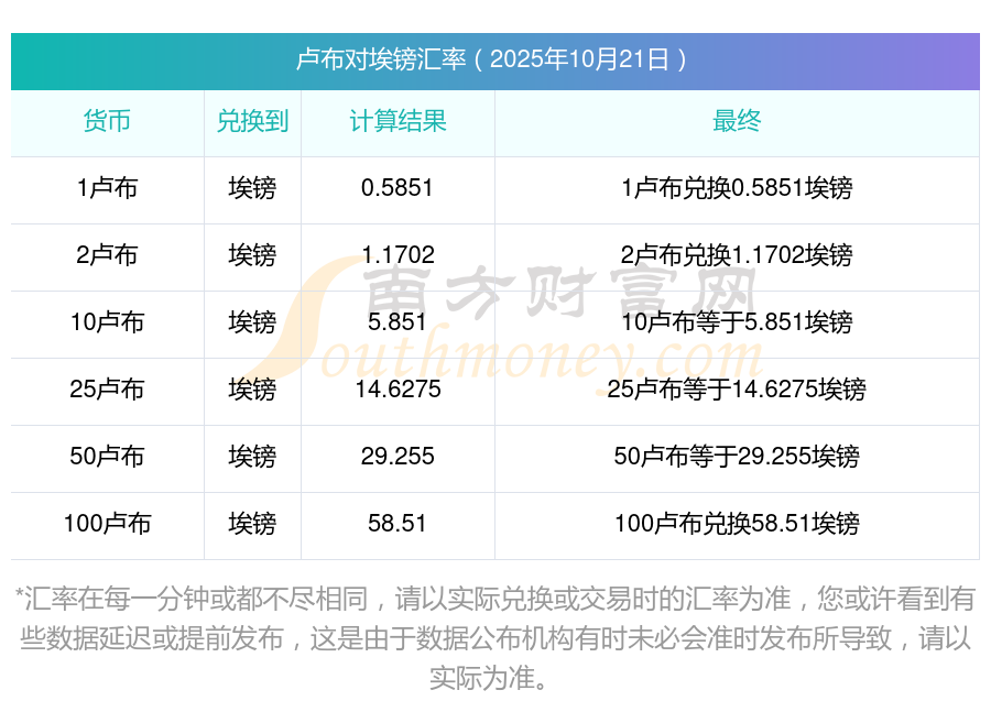 盧布兌換埃鎊匯率是多少(2025年10月21日)