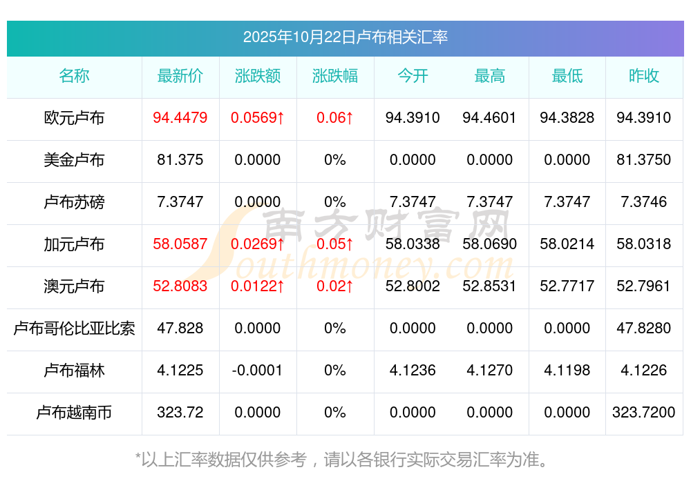 南方財富網(wǎng)為您提供盧布對人民幣匯率最新價格詳情。