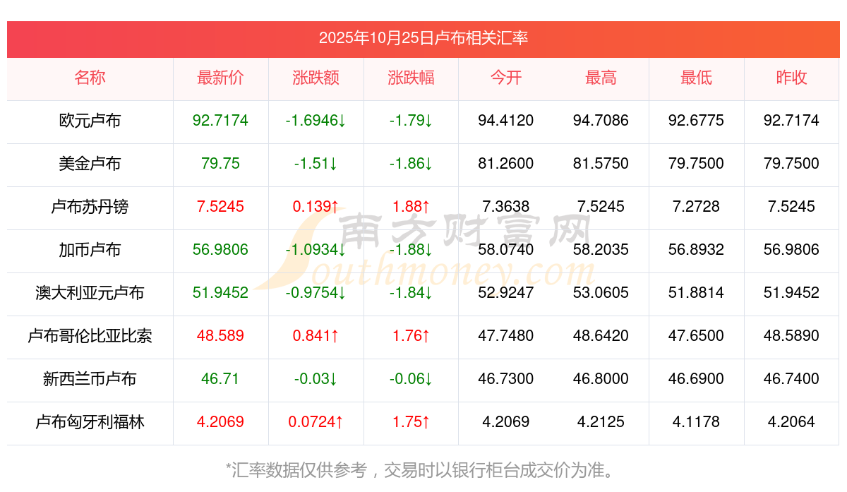 2025年10月25日盧布相關(guān)匯率查詢(xún)