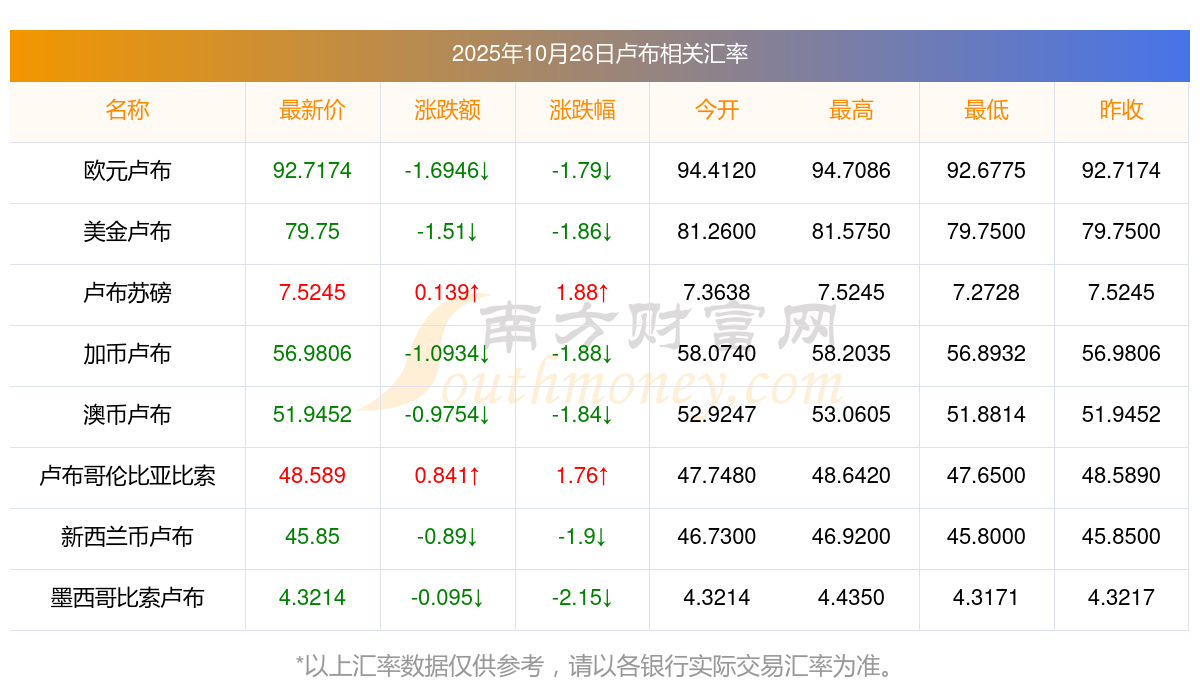 南方財富網(wǎng)為您提供盧布對人民幣匯率最新價格詳情。