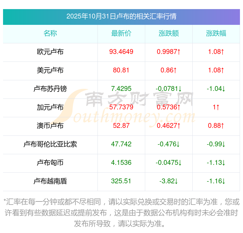 根據(jù)2025年10月31日匯率計算,RUB兌換UYU匯率最新價0.493600:今日開價0.4989,昨日收價0.4989,最高價0.4989,最低價0.4933。