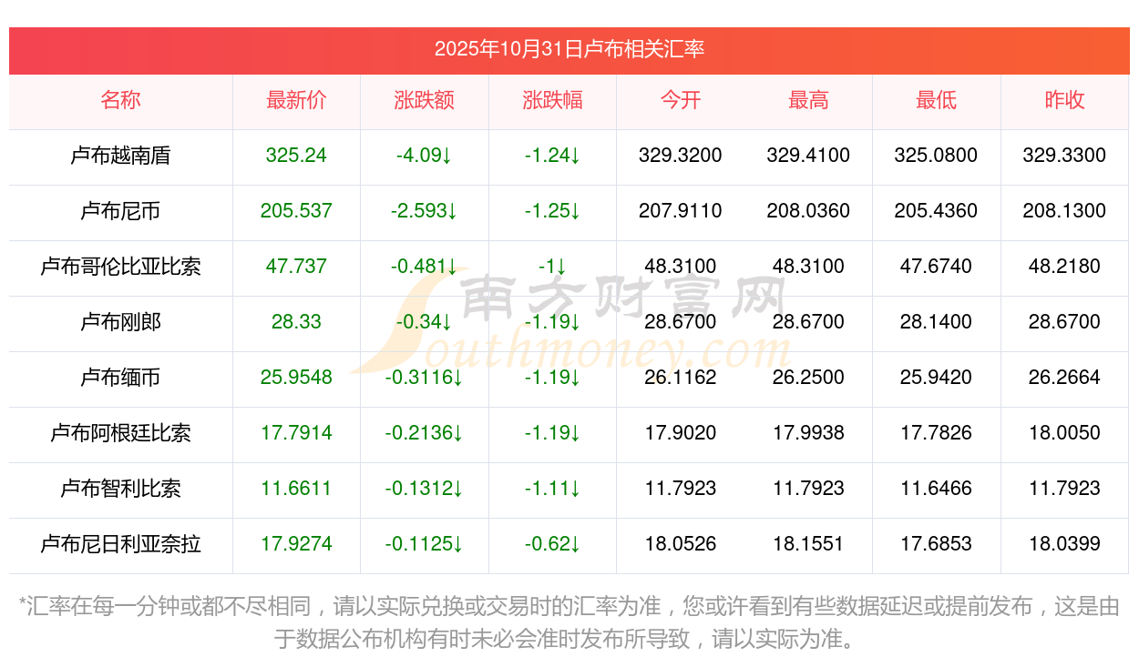 根據(jù)2025年10月31日匯率計(jì)算,RUB兌換COP匯率最新價(jià)47.737000:今日開價(jià)48.3100,昨日收價(jià)48.2180,最高價(jià)48.3100,最低價(jià)47.6740。