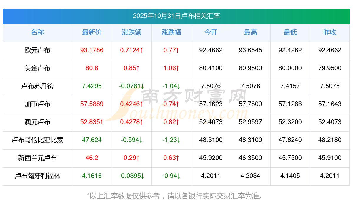根據(jù)2025年10月31日匯率計(jì)算,RUB兌換MMK匯率最新價25.958000:今開價26.1162,昨收價26.2664,最高價26.2500,最低價25.9420。