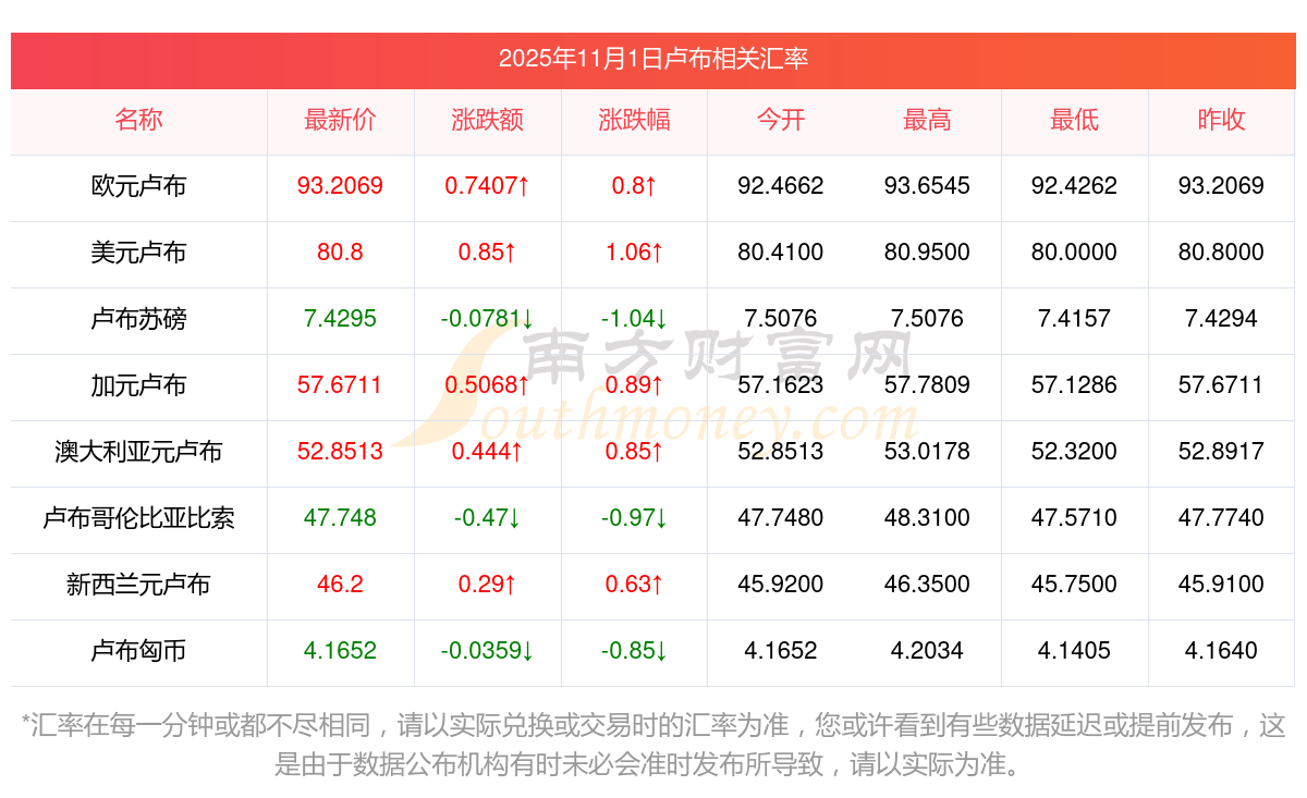 根據(jù)2025年11月1日匯率計(jì)算,盧布兌換智利比索匯率最新價(jià)11.664600,今開(kāi)價(jià)11.6646,昨收價(jià)11.6653,最高價(jià)11.7923,最低價(jià)11.6286。