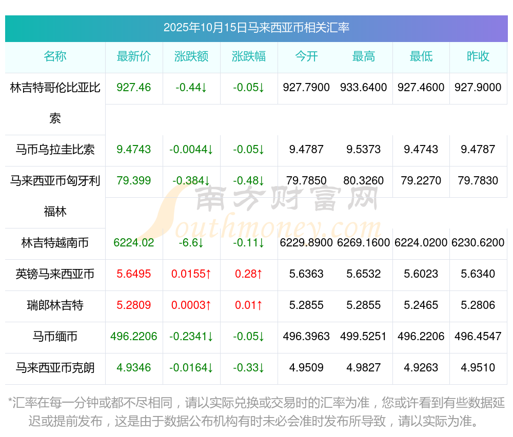 2025年10月15日馬來(lái)西亞幣相關(guān)匯率查詢