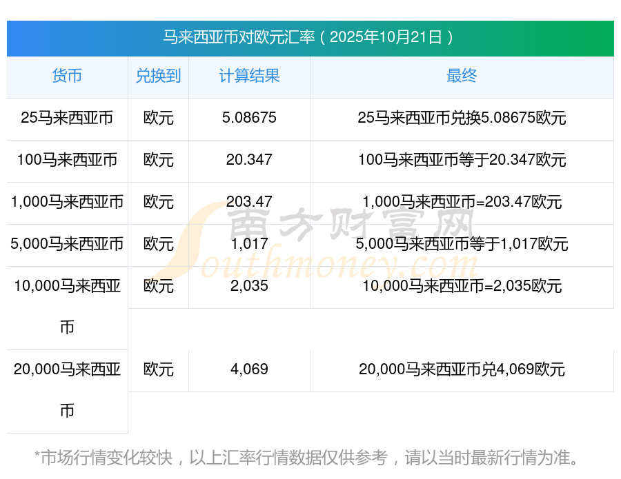 南方財(cái)富網(wǎng)為您提供馬來西亞幣對歐元匯率最新價(jià)格詳情。