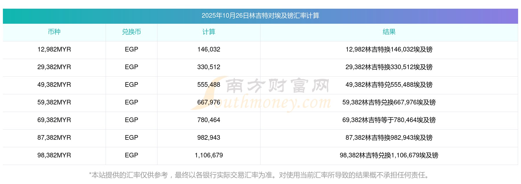 今日1001林吉特對埃及鎊的折算匯率多少?計算方法2025-10-26