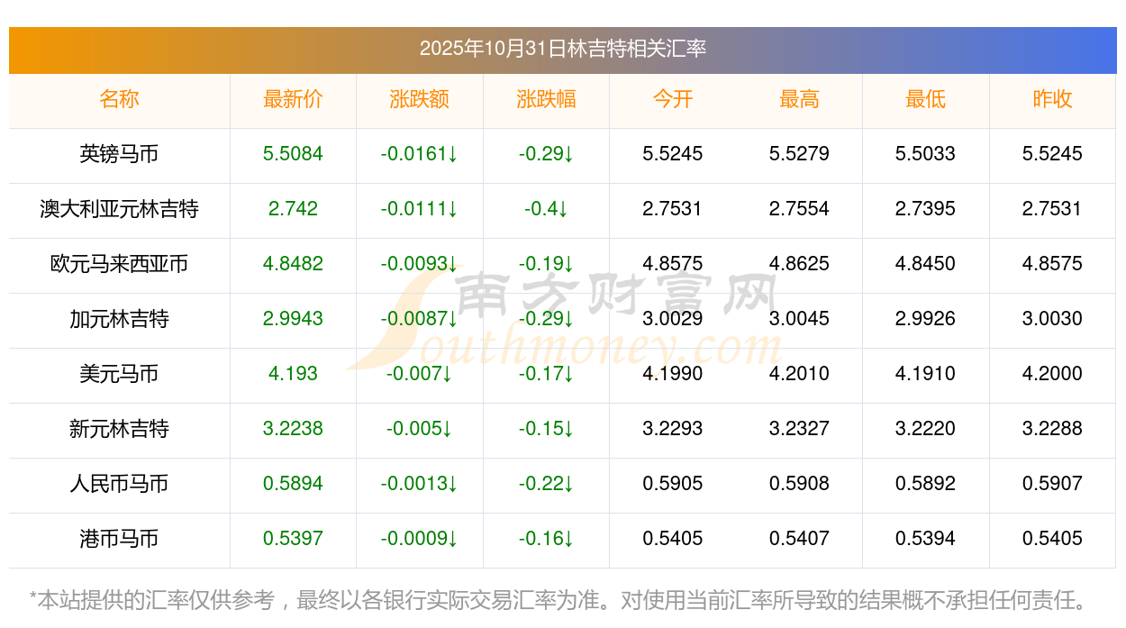2025年10月31日林吉特對(duì)巴西雷亞爾匯率行情