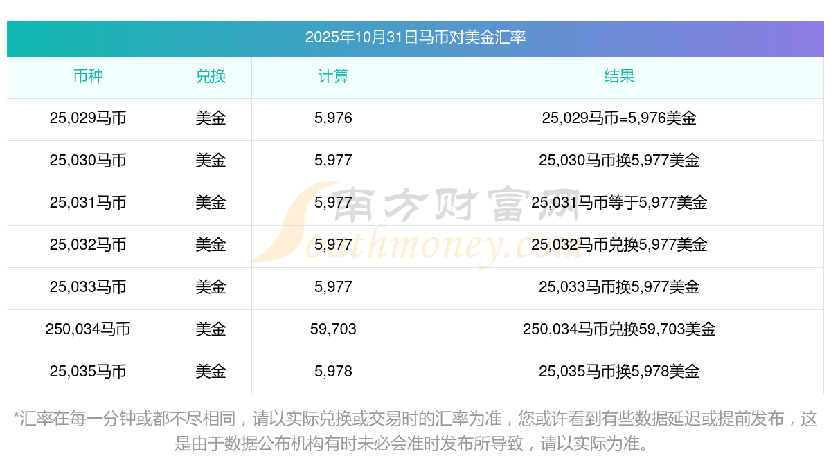 2025年10月31日匯率行情:15馬幣對美金匯率多少