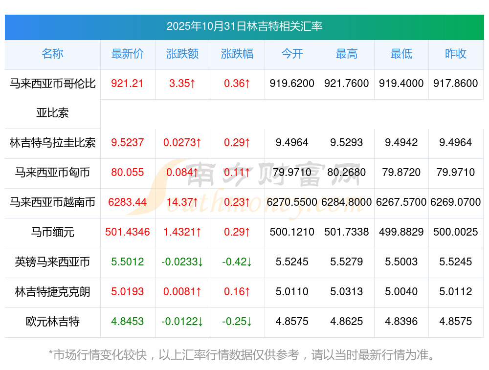 2025年10月31日林吉特相關(guān)匯率查詢