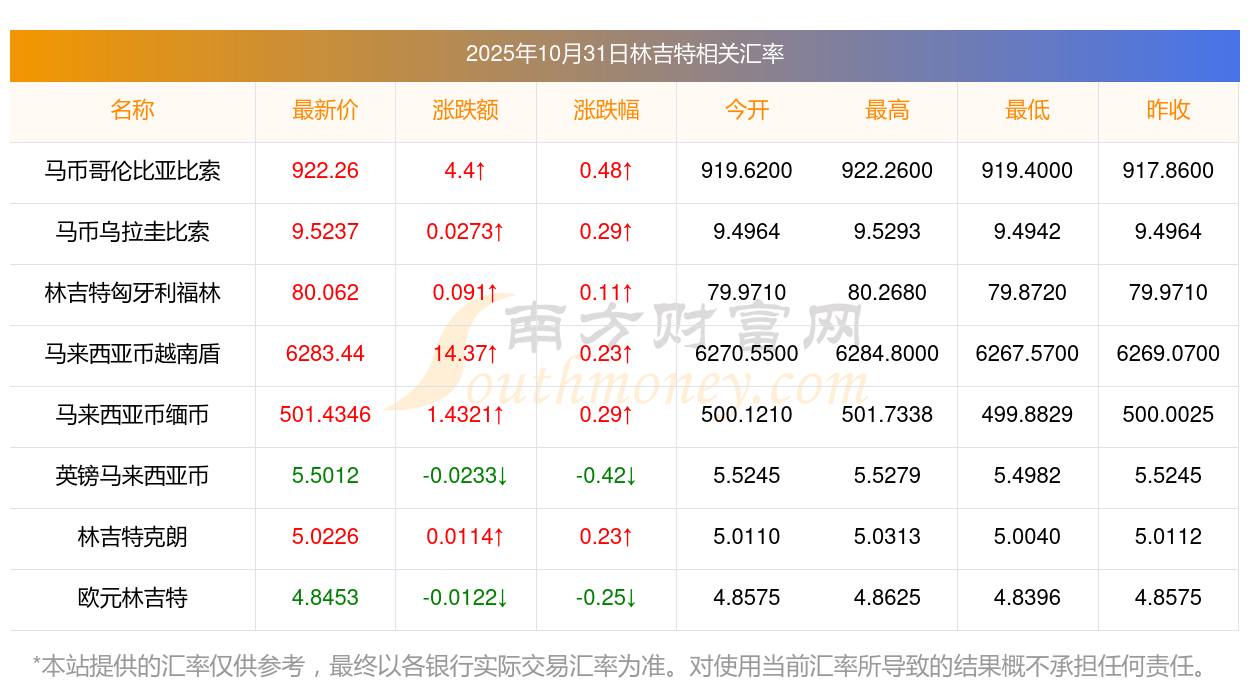 2025年10月31日林吉特相關(guān)匯率查詢