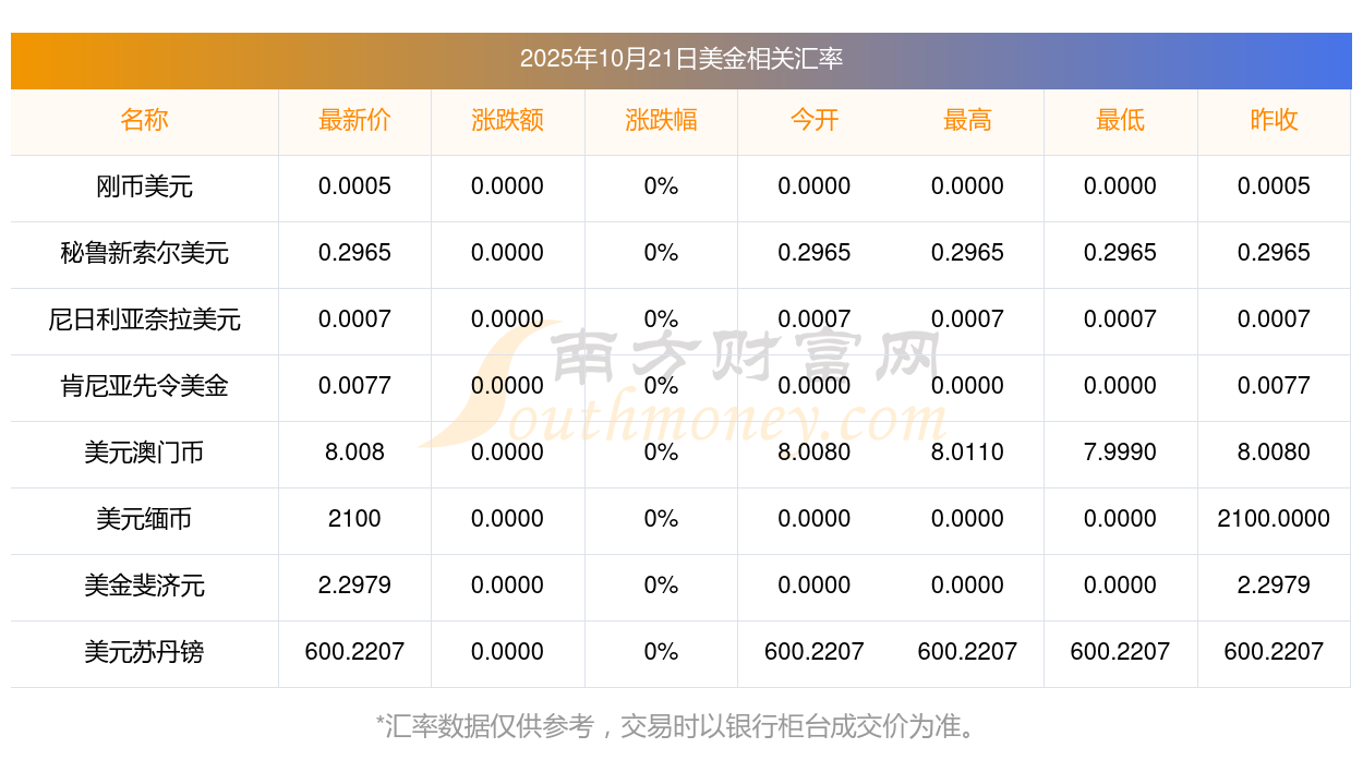 2025年10月21日美金相關(guān)匯率查詢