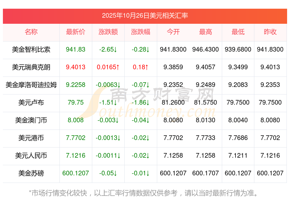 2025年10月26日美元相關匯率查詢