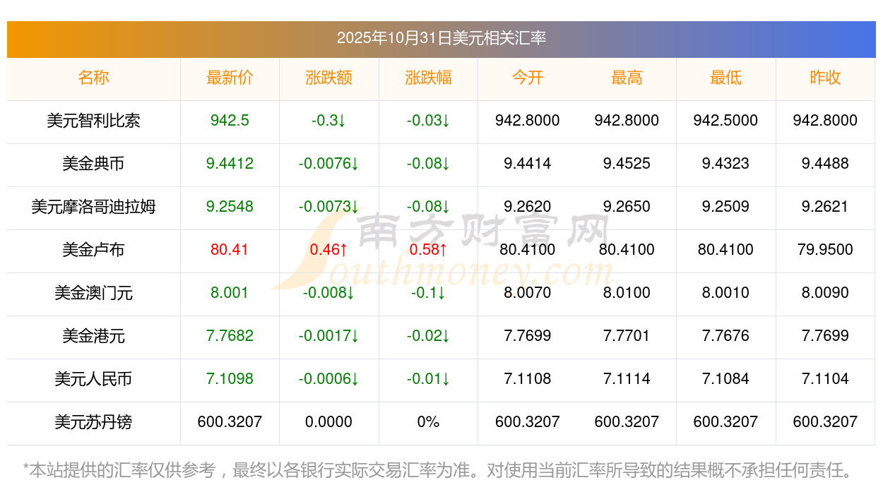 2025年10月31日美元相關匯率查詢