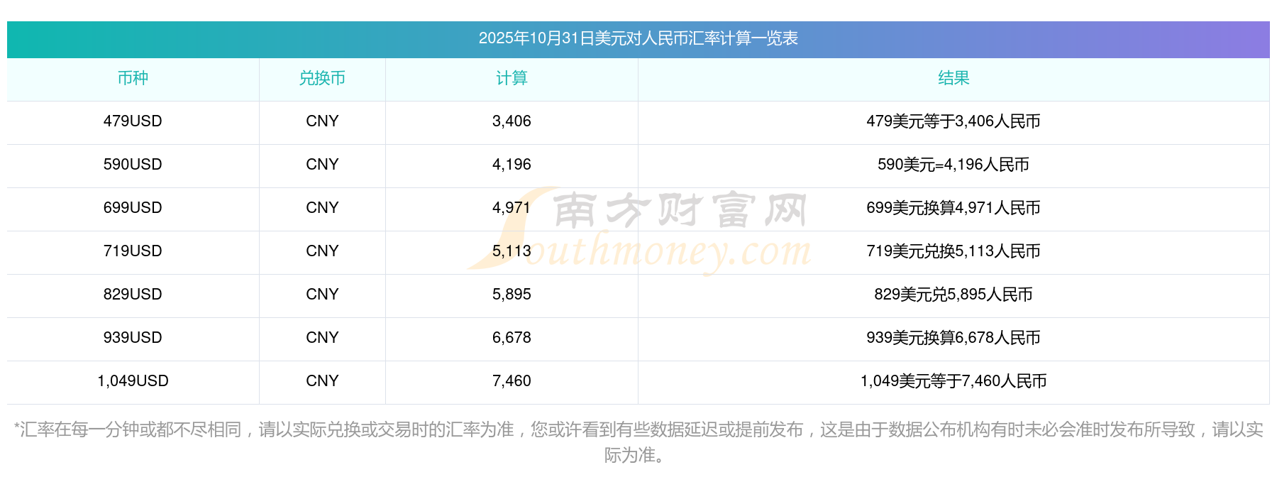 今日匯價2025年10月31日:3美元兌人民幣匯價表