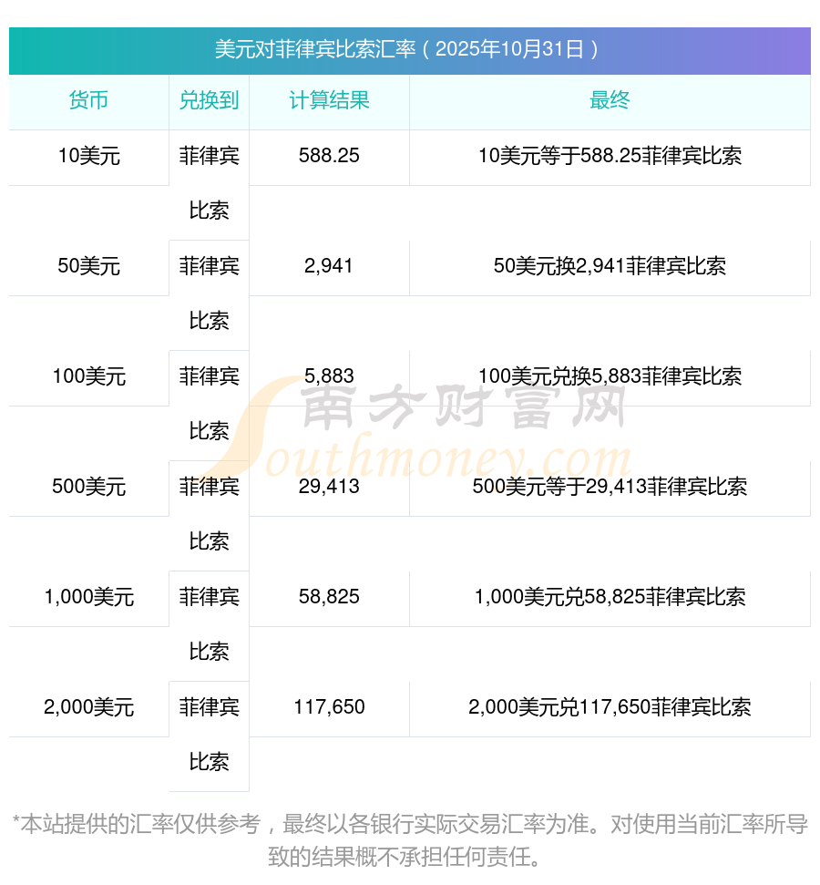 2025年10月31日匯率更新!今天89美元兌換菲律賓比索是多少?