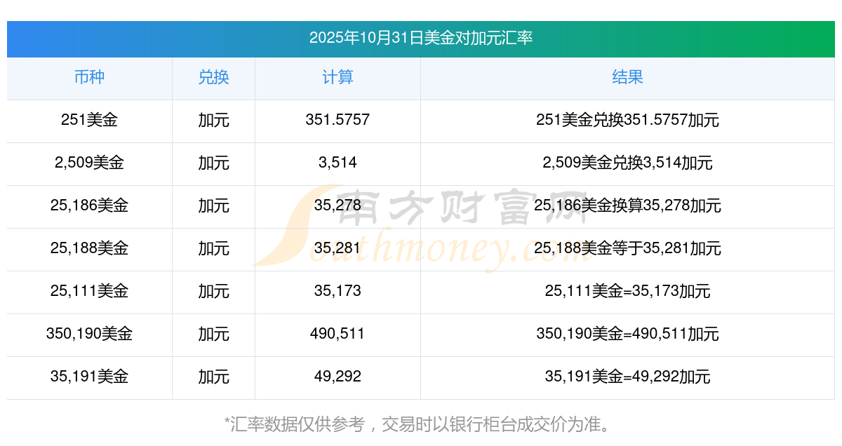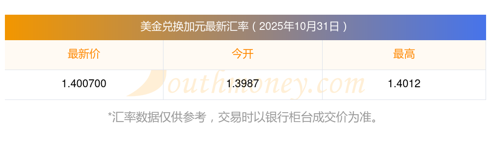 今日美金匯價(jià):2025年10月31日32美金兌加元匯價(jià)一覽表