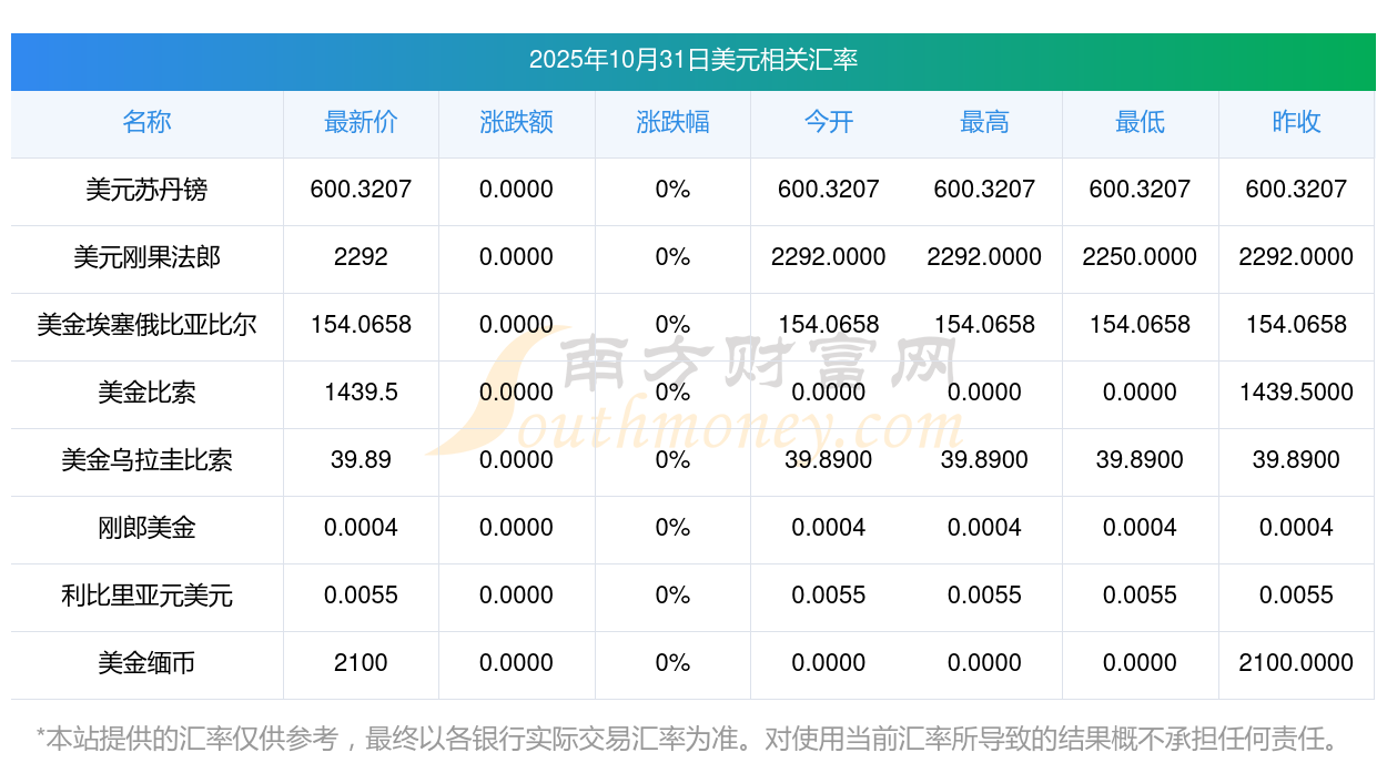 2025年10月31日美元兌換蘇丹鎊最新匯率:600.320700,今開:600.3207,昨收:600.3207,最高:600.3207,最低:600.3207。