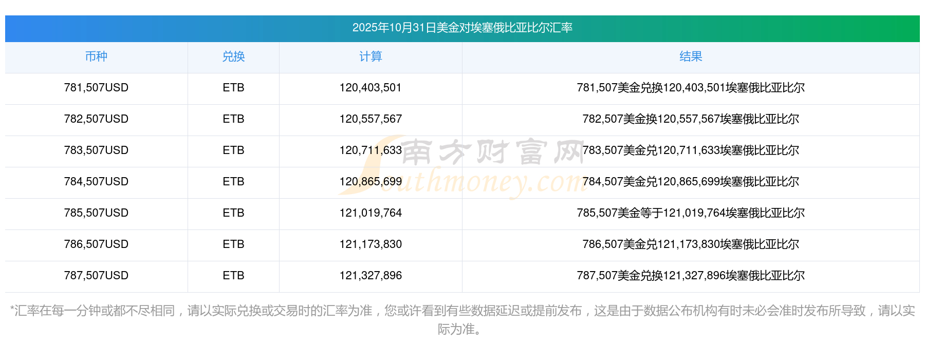 匯率實(shí)時(shí)更新!71美金兌換埃塞俄比亞比爾匯率表(2025年10月31日)