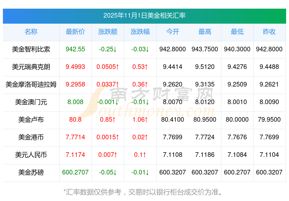 根據(jù)2025年11月1日匯率計算,USD兌換CLP匯率最新價942.550000:今日開價942.8000,昨日收價942.8000,最高價943.7500,最低價940.3000。