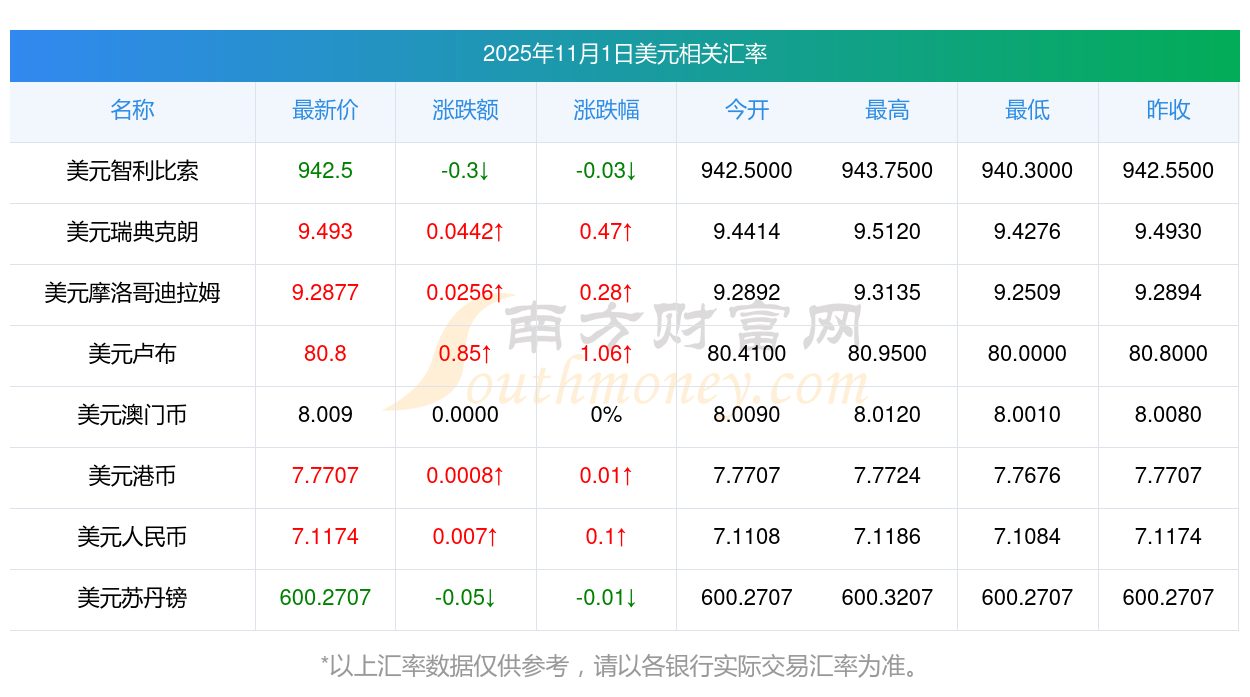 2025年11月1日美元相關(guān)匯率查詢