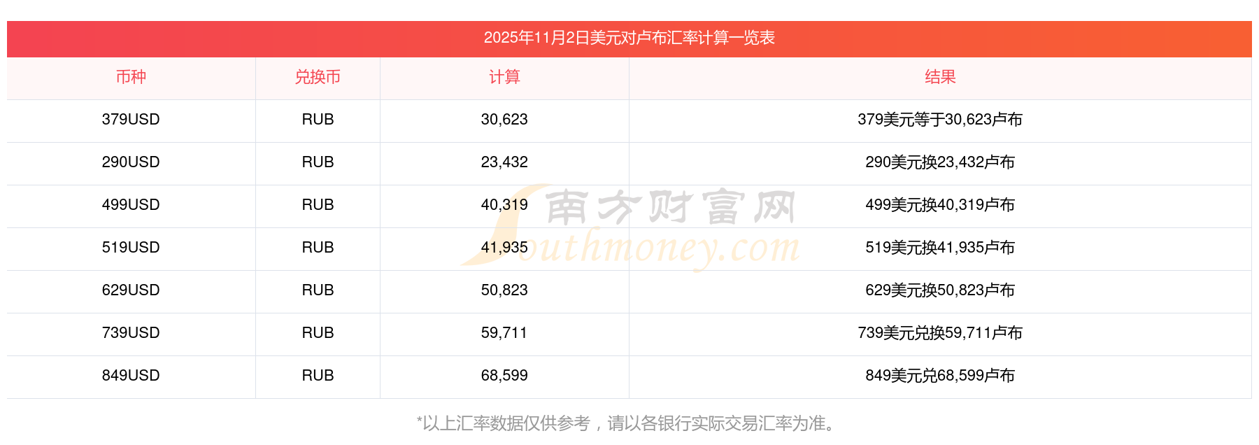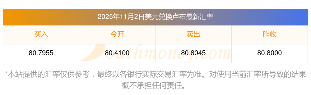 今日美元匯價:2025年11月2日31美元兌盧布匯價一覽表