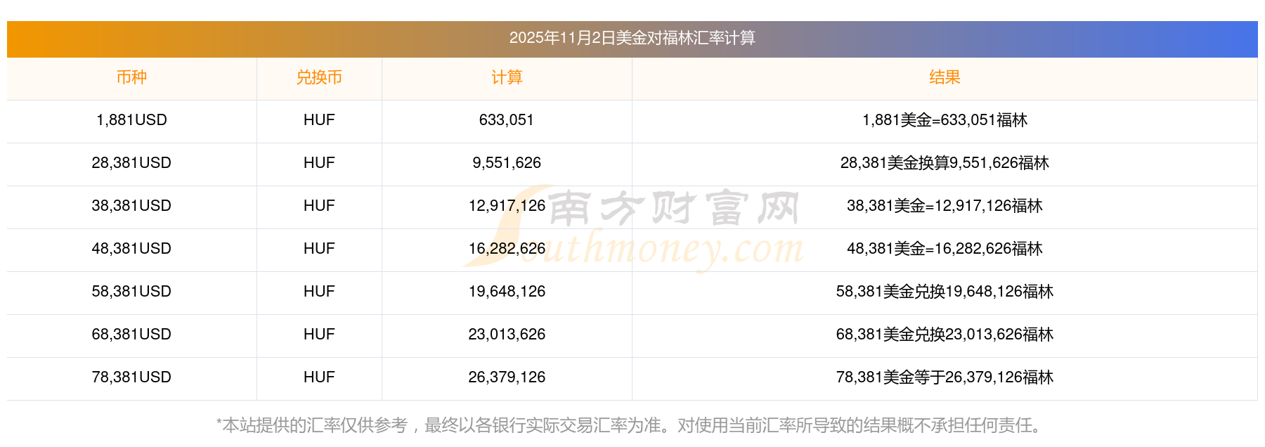 今日匯率換算:45美金對換福林匯率是多少2025年11月2日