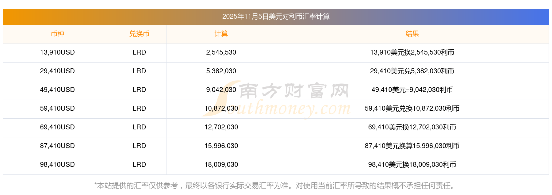 今日匯率換算:60美元對換利幣匯率是多少2025年11月5日