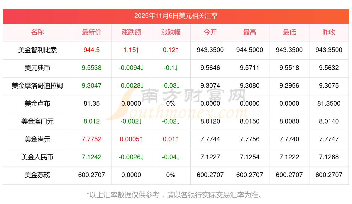 根據(jù)2025年11月6日匯率,美元兌換埃鎊匯率最新47.410000,今開47.4100,昨收47.4100,最高47.4100,最低47.4100。