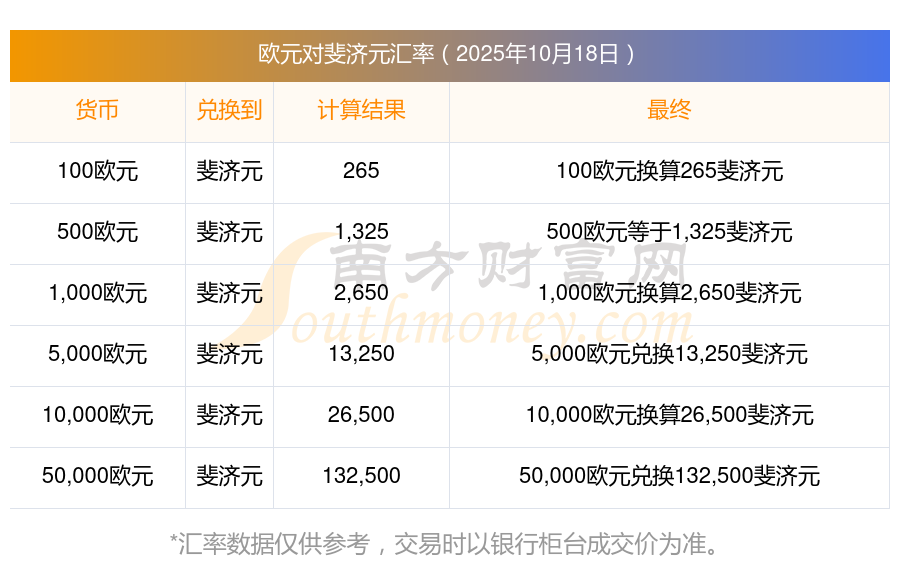 今天匯率計(jì)算:58歐元兌換多少斐濟(jì)元?(2025年10月18日)
