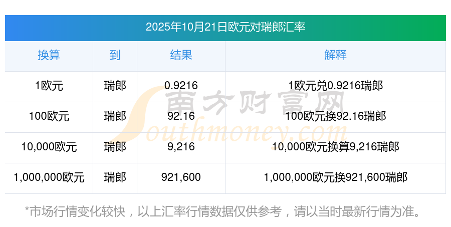 歐元外匯行情 2025-10-21 今天100歐元與瑞郎兌換
