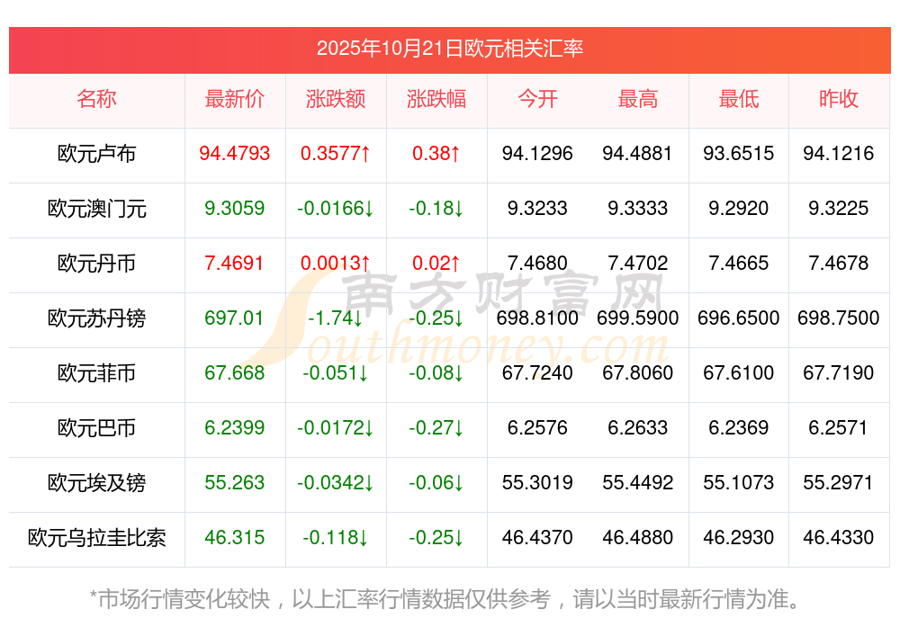 2025年10月21日歐元相關(guān)匯率查詢