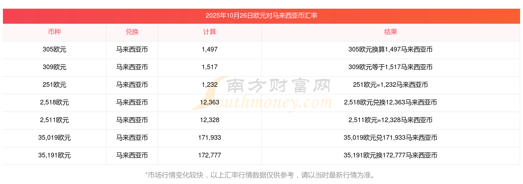 南方財富網(wǎng)為您提供歐元對馬來西亞幣匯率最新價格詳情。
