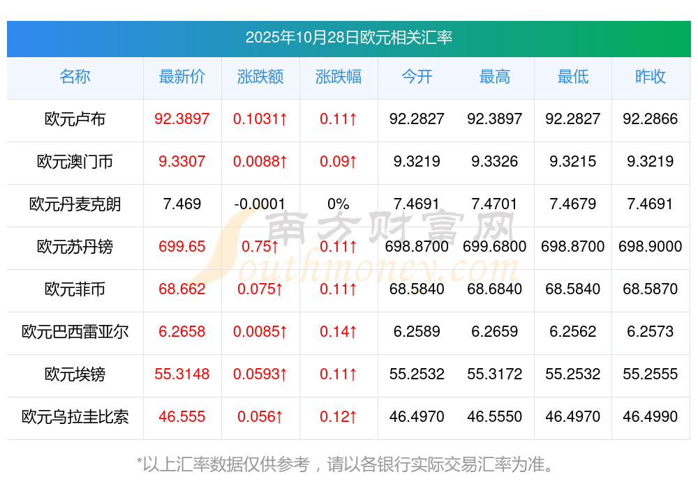根據(jù)今天2025年10月28日匯率計算,EUR兌換UYU匯率最新價46.555000,今開價46.4970,昨收價46.4990,最高價46.5550,最低價46.4970。