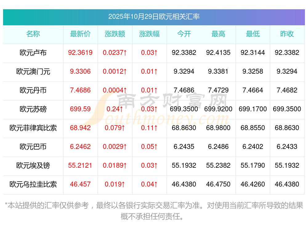 2025年10月29日最新消息,歐元兌換越南幣最新匯率為30674.760000,今開為30676.0700,昨收為30676.0700,最高為30701.0900,最低為30668.1800。