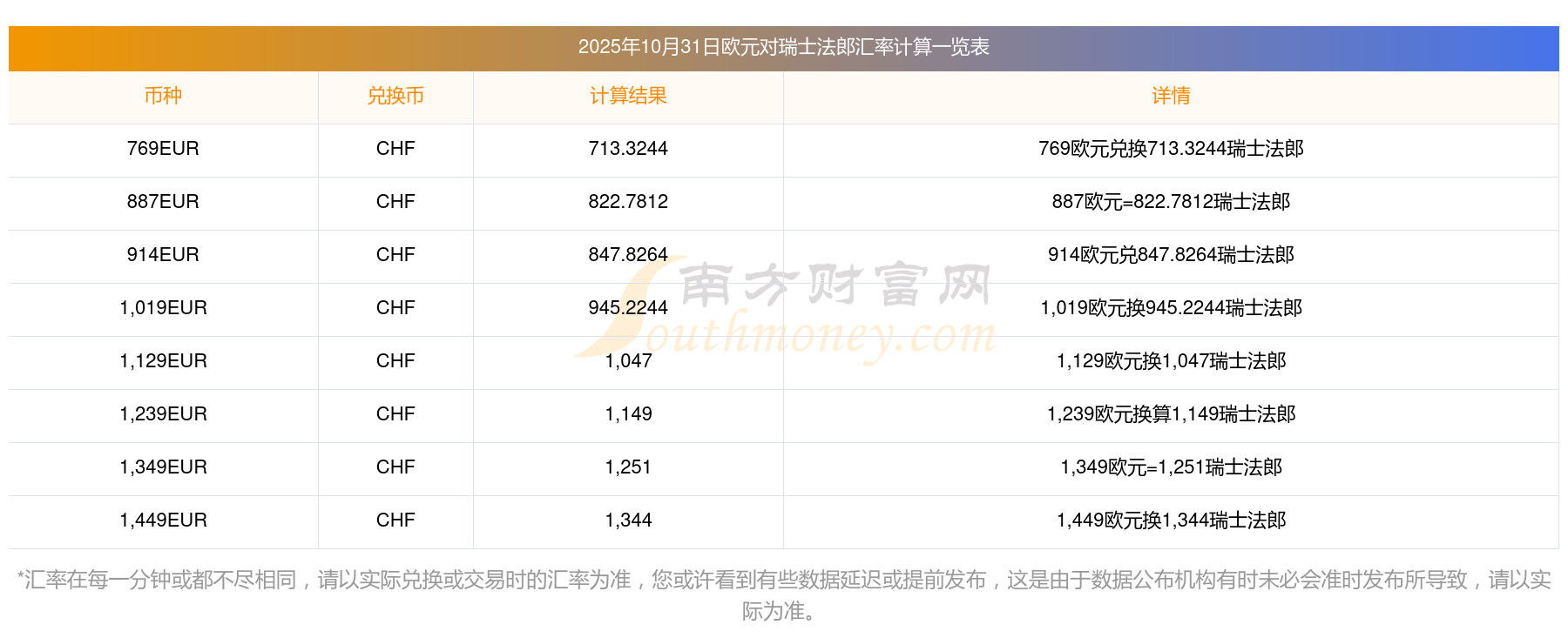 2025年10月31日匯率更新!今天85歐元兌換瑞士法郎是多少?