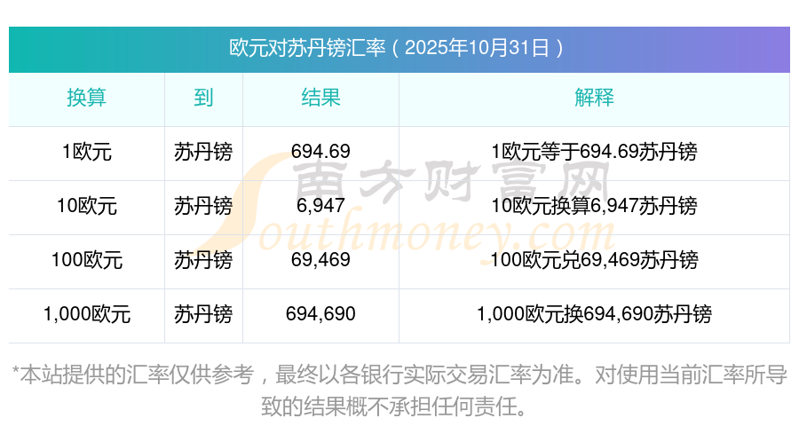 今天135歐元換成蘇丹鎊匯率計(jì)算多少?2025-10-31