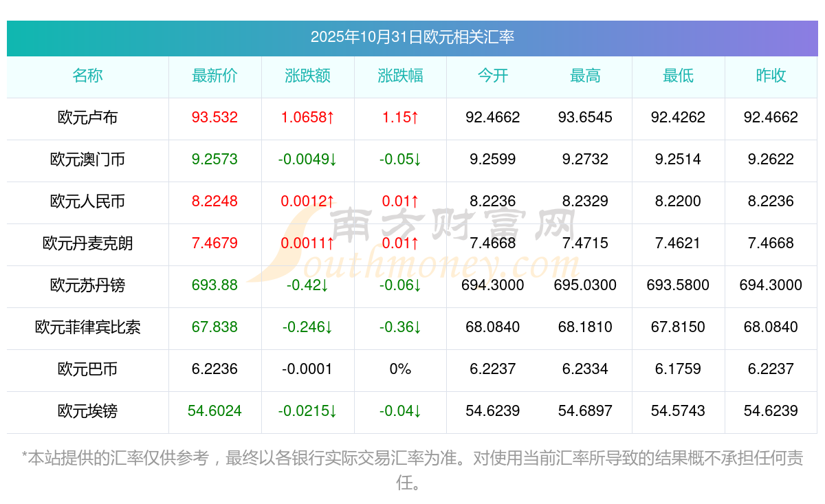 2025年10月31日歐元相關(guān)匯率查詢