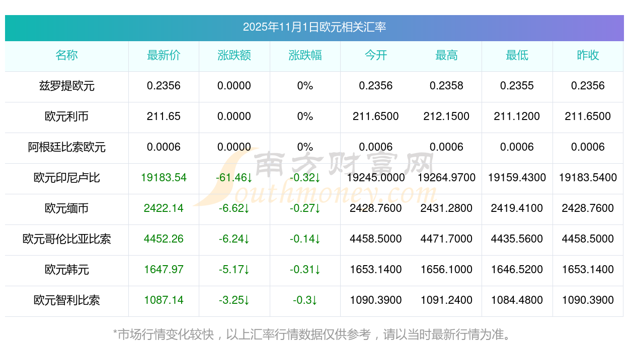 根據(jù)2025年11月1日匯率,歐元兌換印尼盧比匯率最新價19183.540000,今開價19245.0000,昨收價19183.5400,最高價19264.9700,最低價19159.4300。