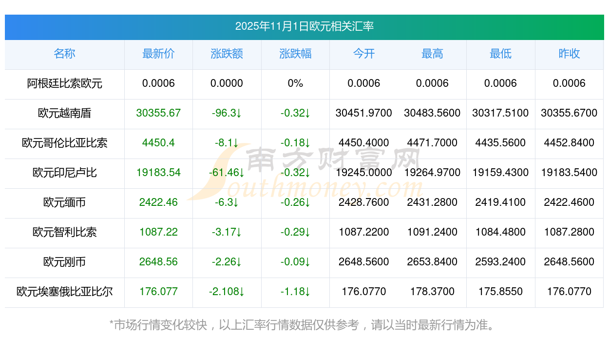 根據(jù)2025年11月1日匯率,歐元兌換澳元匯率最新1.763600,今開1.7636,昨收1.7623,最高1.7700,最低1.7597。