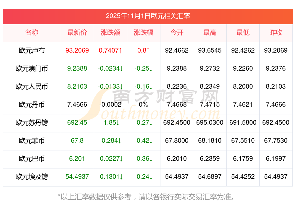 2025年11月1日最新消息,歐元兌換斐濟(jì)刀最新匯率為2.646200,今開為2.6547,昨收為2.6462,最高為2.6563,最低為2.6429。