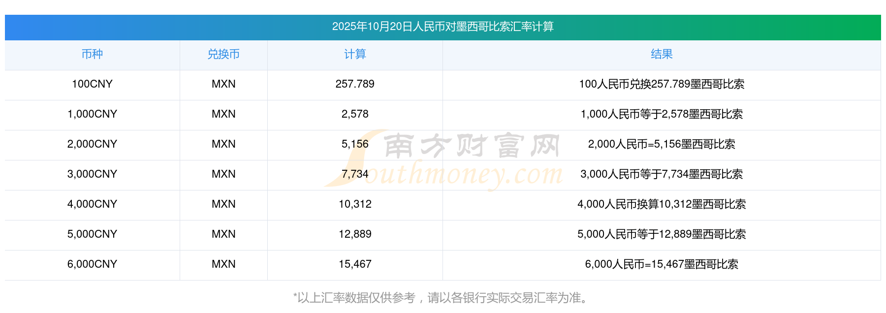 2025年10月20日人民幣對墨西哥比索匯率計算