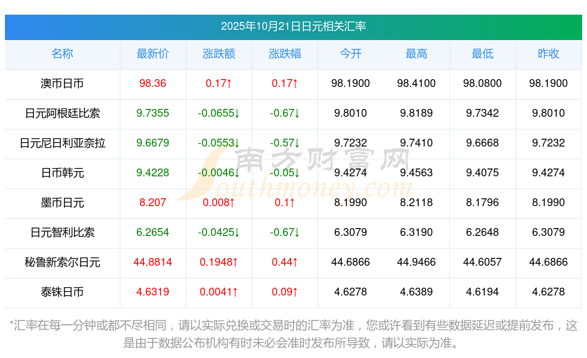 2025年10月21日日元相關(guān)匯率查詢