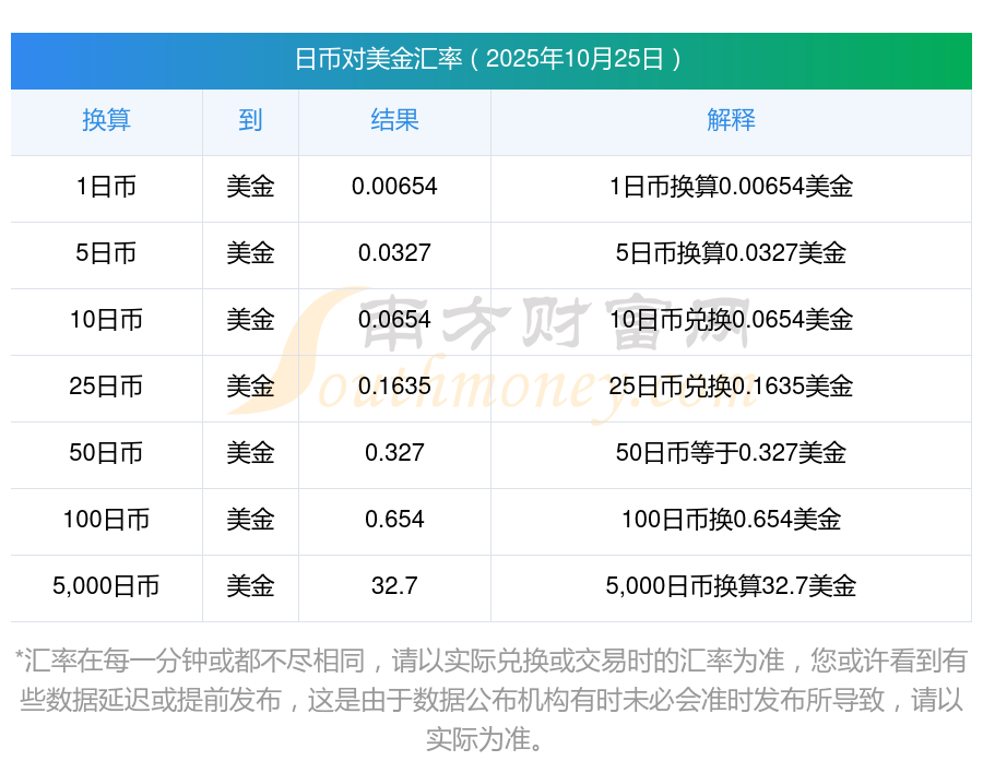 南方財富網(wǎng)為您提供日幣對美金匯率最新價格詳情。