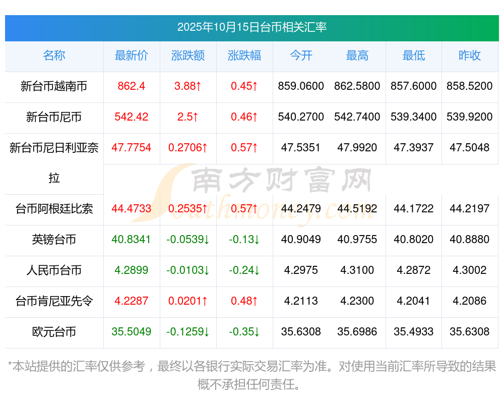 2025年10月15日臺幣相關(guān)匯率查詢