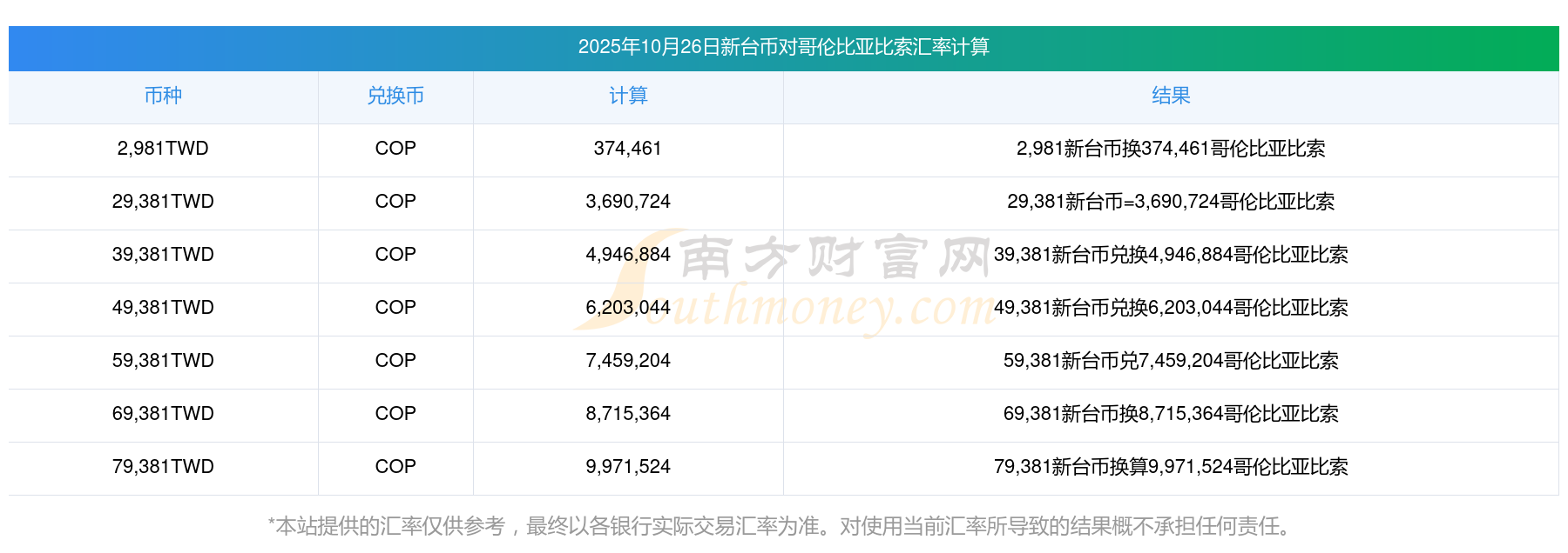 2025年10月26日新臺幣與哥倫比亞比索的兌換匯率計算如下: