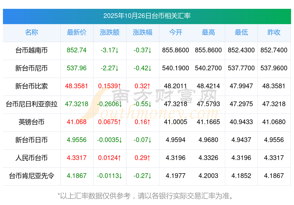 根據(jù)2025年10月26日匯率計算,TWD兌換CAD匯率最新價0.045380,今開價0.0455,昨收價0.0454,最高價0.0456,最低價0.0454。