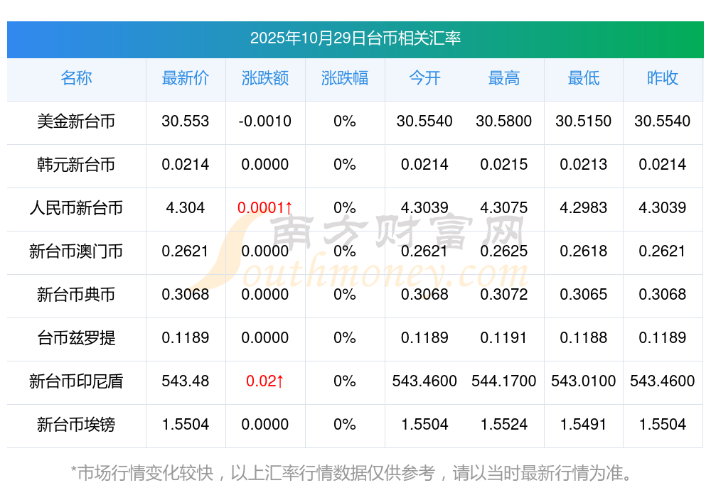 根據(jù)2025年10月29日匯率計算,TWD兌換ZAR匯率最新價0.561490:今開價0.5615,昨收價0.5615,最高價0.5622,最低價0.5610。