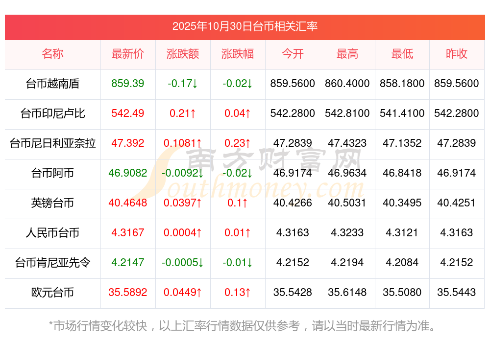 2025年10月30日臺(tái)幣相關(guān)匯率查詢