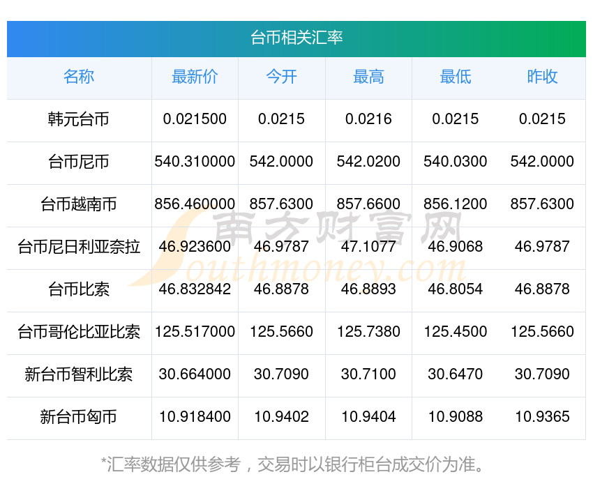 根據(jù)2025年10月31日匯率計算,TWD兌換CAD匯率最新價0.045510:今開價0.0456,昨收價0.0456,最高價0.0456,最低價0.0455。